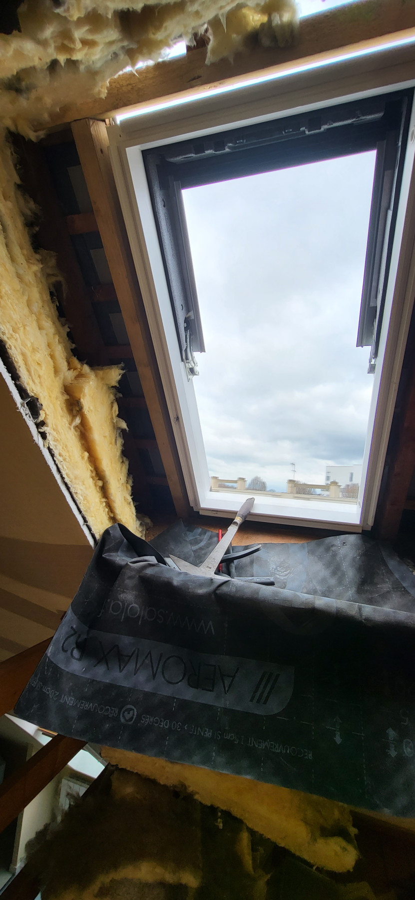Création Fenêtre de toit, ouverture placo, dépose de la laine de verres, création du bâti du velux a posé, équerrage et centrage avec un velux plus bas sur toiture existant.